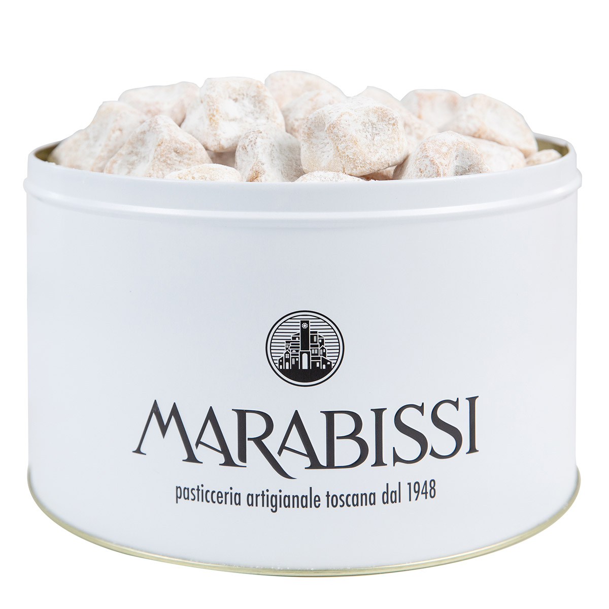 Farina di MANDORLE 43%, zucchero, albume d’UOVO (da allevamento a terra), sciroppo di glucosio-fruttosio, sciroppo di zucchero invertito, zucchero a velo (zucchero, amido di mais), conservante: acido sorbico, agente lievitante: bicarbonato d’ammonio.